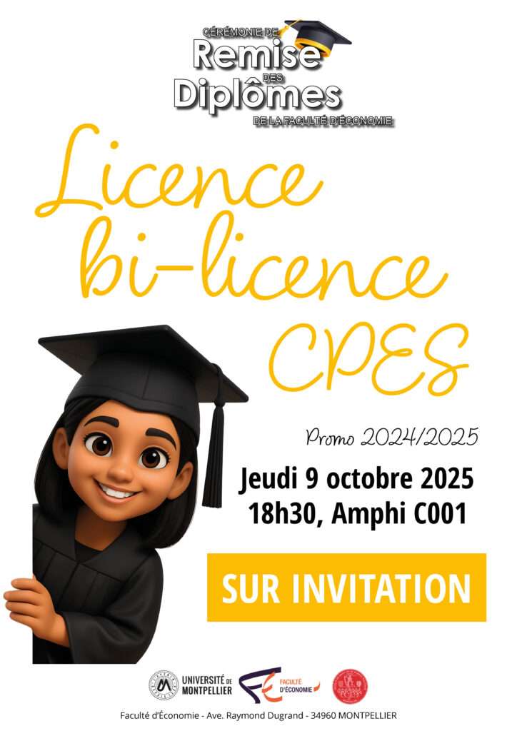 Cérémonie de remise des diplômes Publié le 9 octobre 2025 dans Agenda Licence, bi-licence et CPES Jeudi 9 octobre 2025, 18h30, Amphi C001 SUR INVITATION