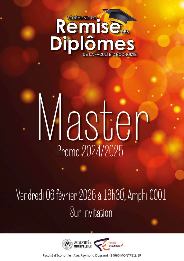 Cérémonie de remise des diplômes de master Type d'évènement : CÉRÉMONIE DE REMISE DE DIPLÔMES Dates : 6 février 2026 Horaires : 18h30 Lieu : Amphi C001 / SUR INVITATION Promo 2024/2025 SUR INVITATION