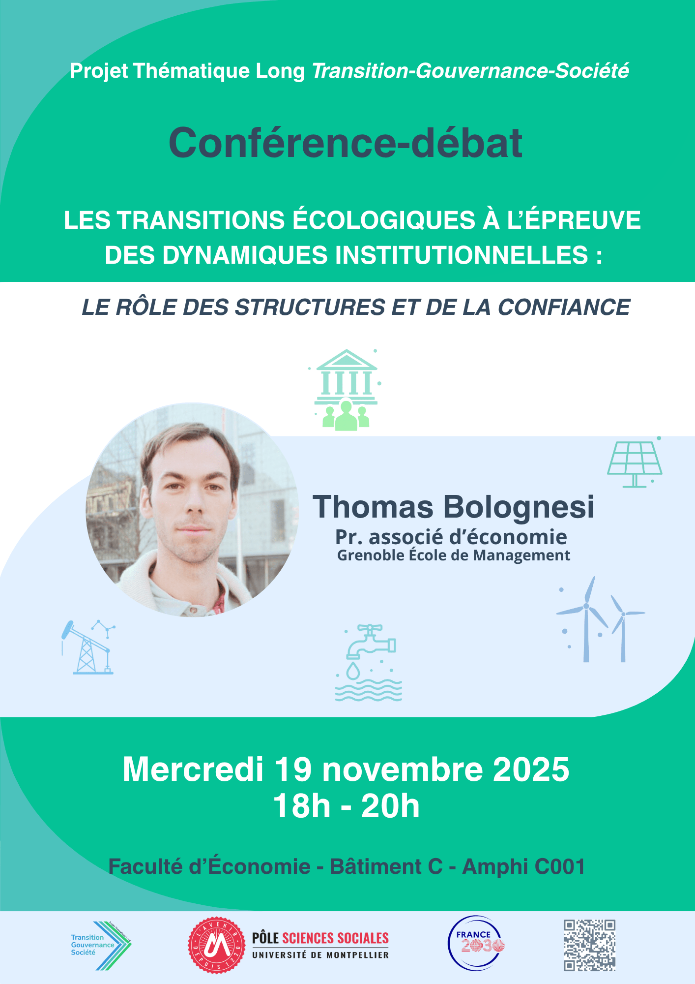 Les travaux de recherche de Thomas Bolognesi, notamment sur la gouvernance de l’eau et la confiance envers les institutions, offriront un éclairage inédit sur les mécanismes d’acceptabilité sociale et de légitimité des politiques de transition, au cœur des réflexions portées par le PTL Transition – Gouvernance – Société.