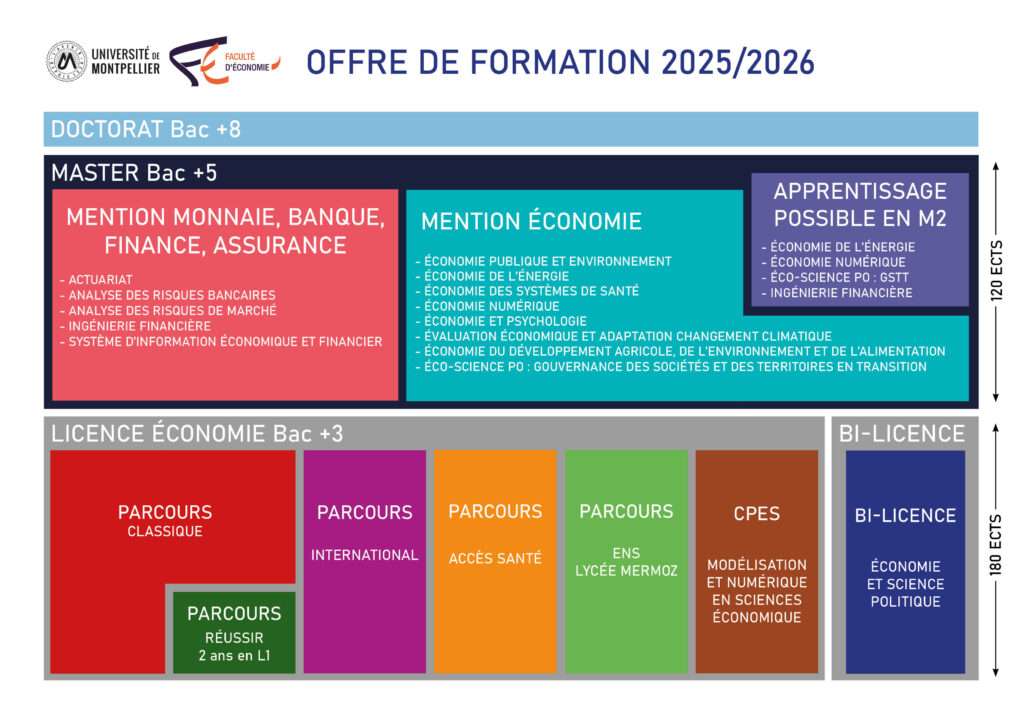 La Faculté d’Économie de l’Université de Montpellier propose une offre de formation complète, innovante et ouverte sur le monde professionnel. Elle accompagne les étudiants tout au long de leur parcours, de la licence au Master 2, en leur offrant des enseignements de qualité, adossés à la recherche et à la réalité économique contemporaine.
